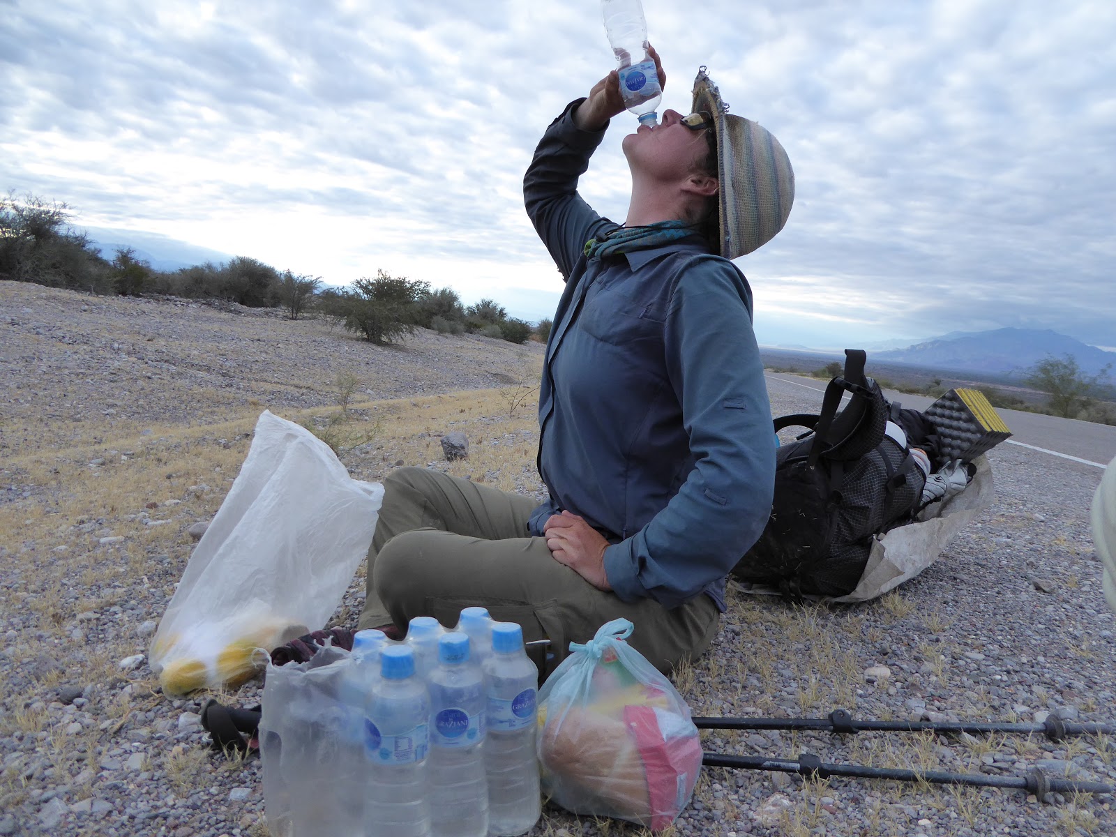 As early evening settled in, two people stopped in quick succession. One car stopped and turned around to give us water, smiling and wishing us luck. The other vehicle that stopped was a truck marked 'explosives' on the back - the driver got out and put water and snacks on the side of the road, telling Fidgit that he had seen us on his way past earlier. Water AND snacks?! What amazing people inhabit this earth! Boosted again by the kindness of strangers, I was able to walk a bit into the night to complete our first 40 kilometer day this season. It also happened to be day 300 of our entire trip, so there was a lot to celebrate. I celebrated by eating dinner and falling fast asleep.